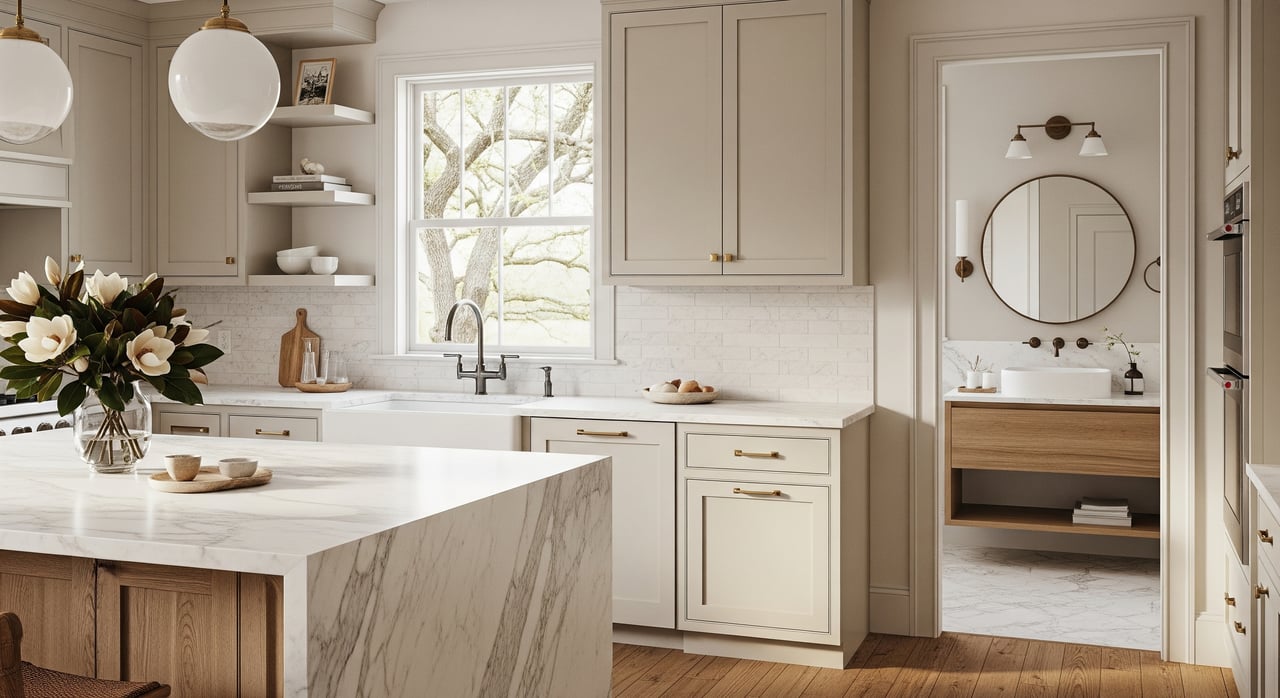 Think warm neutrals like cream, warm white, and soft greige, with muted accents such as sage or powder blue. For cabinetry, consider inset or framed doors with raised panels in off-white or muted tones, not high gloss. Pair with honed or lightly veined stone, such as limestone or honed marble, or quartz that mimics natural stone.